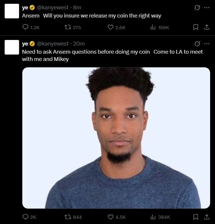 Kanye West, now legally known as Ye, posted on X today requesting a meeting with crypto trader Ansem, fueling speculation about the ownership status of his social media account with 32.7 million followers.