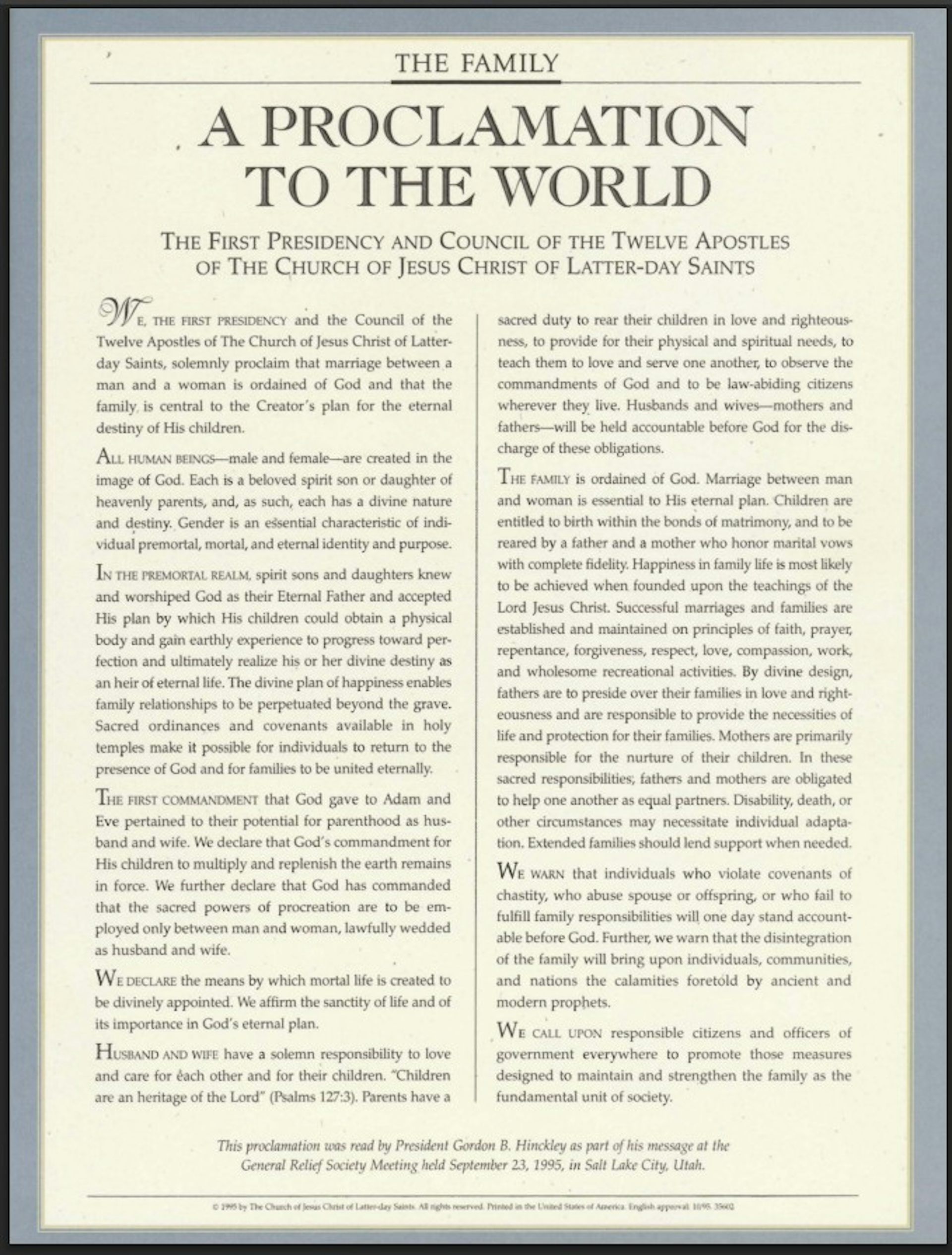The 1995 official Mormon document, ‘The Family: A Proclamation to the World’.