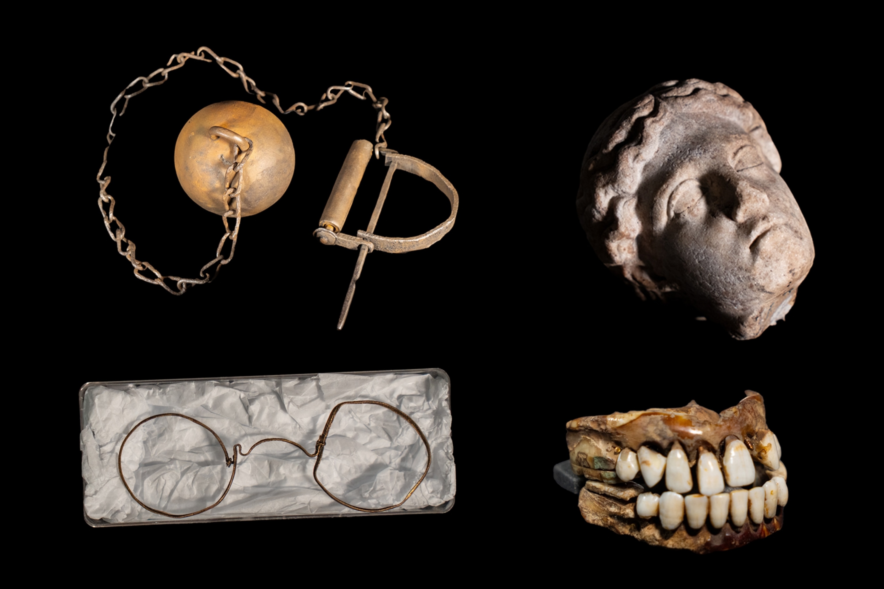 These remarkable finds are featured in the London Museum Docklands’ exhibit on mudlarking in the River Thames (clockwise from top left): ball and chain from the late 1600s; Roman marble head, probably of a goddess; 18th-century dentures made from human teeth; and glasses from around 1600.